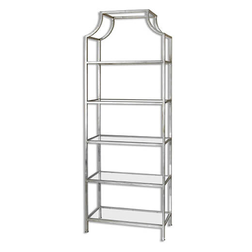 Transitional in style, this forged iron etagere features a bright silver leaf finish with five tempered glass shelves.